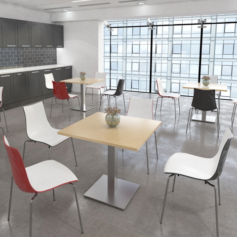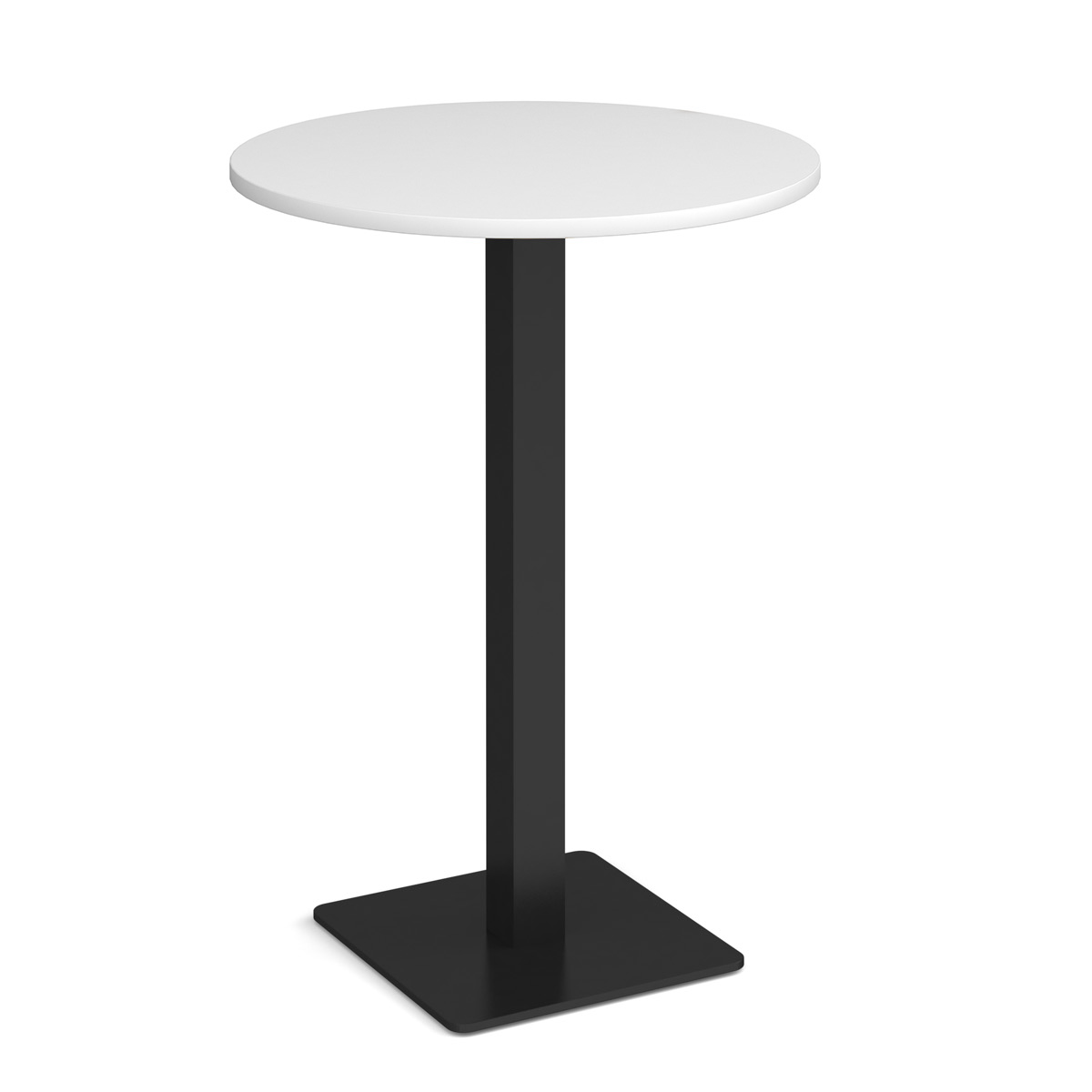 - Circular poseur tables with square column and flat square base